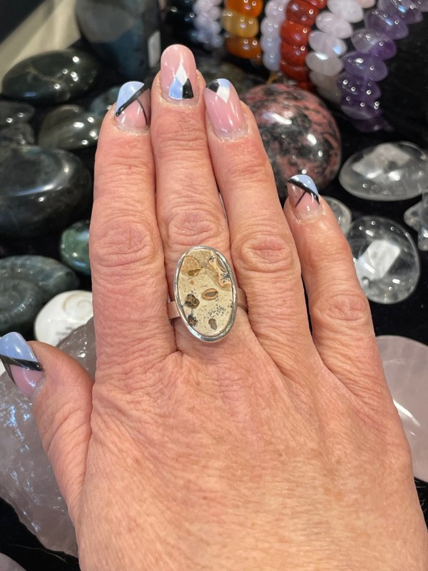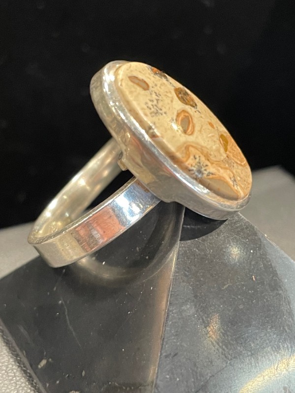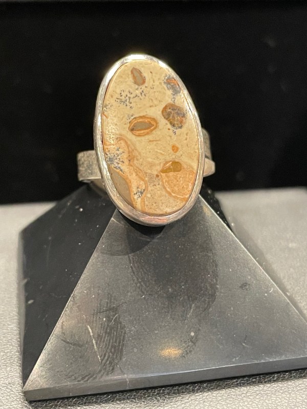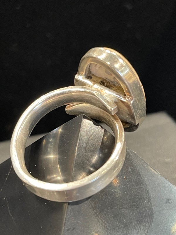 Découvrez cette bague avec pierre semi précieuse cabochon plat spécialement choisie pour ses dessins unique et sa qualité. Montée sur de l’argent 925, cette bague est réglable toutefois elle risquerait de ne pas supporter des changements de tailles répétés.