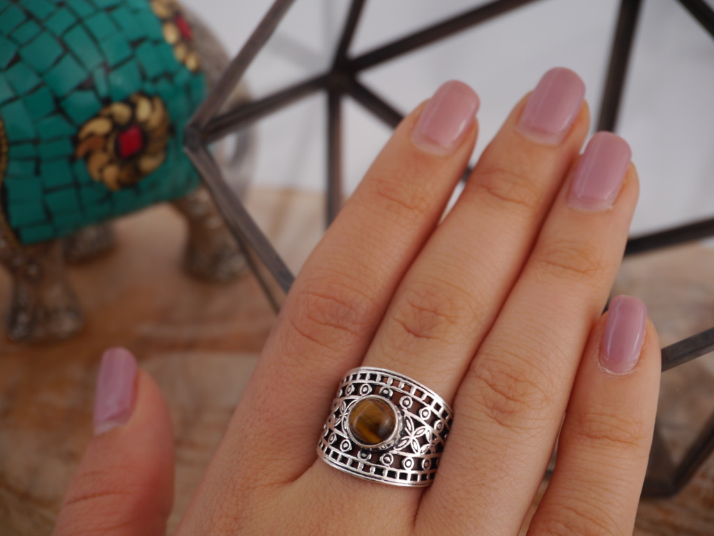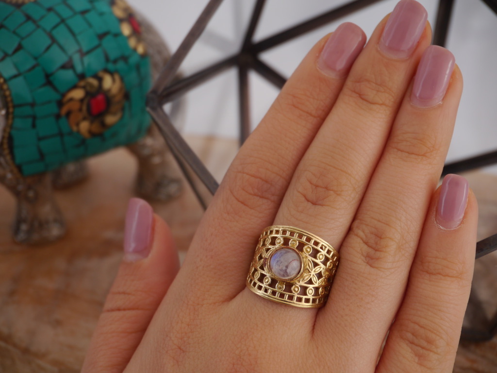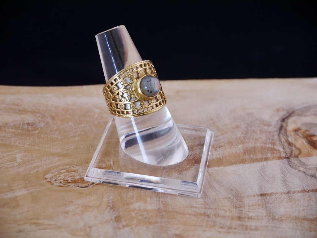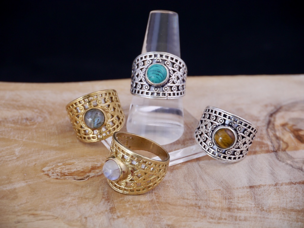 Vous apprécierez ce bijou fabriqué dans un alliage de minerais naturels à base de laiton doré ou argenté, orné d’une pierre (pierre de lune, oeil de tigre ou turquoise).