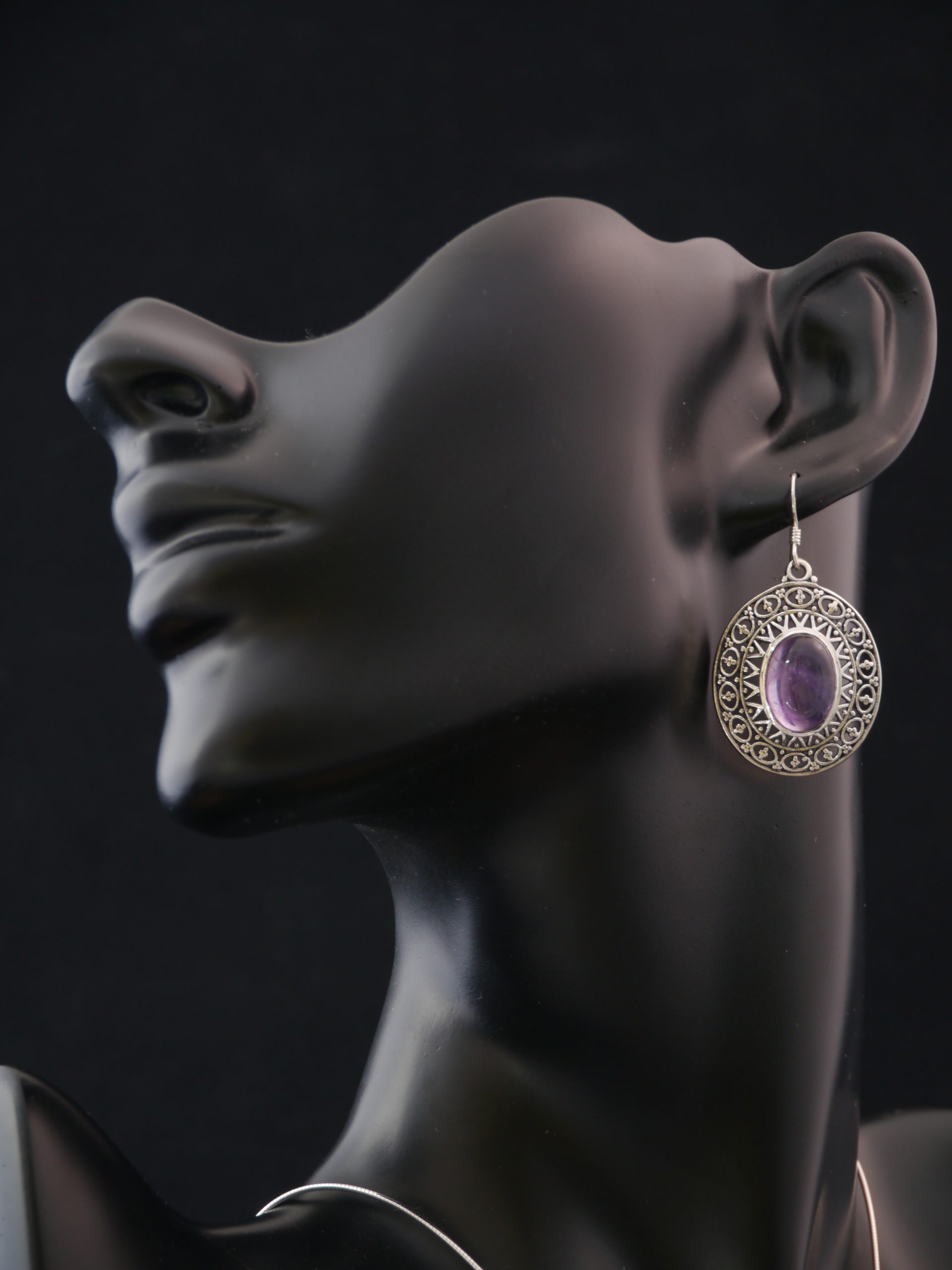 Vous apprécierez ces boucles d’oreilles en argent 925 pour leur travail sur l’argent et la qualité des pierres semi précieuses en Améthyste qui les composent.