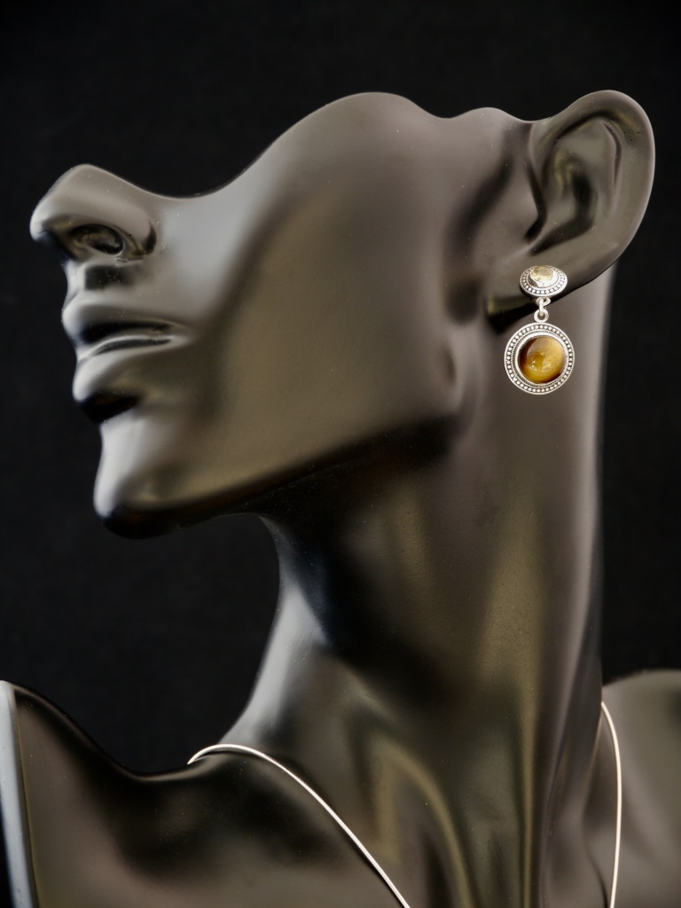 Vous apprécierez ces boucles d’oreilles en argent 925 pour leur travail sur argent et la qualité des pierres semi précieuses en Oeil de Tigre qui les composent.